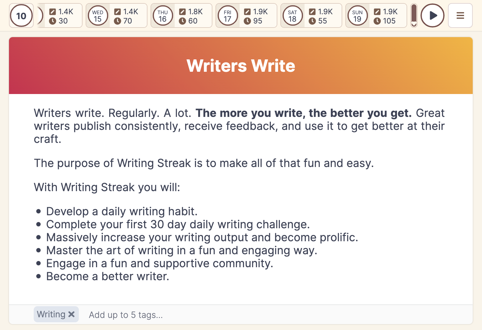 Now it's time to start writing - create an account, and begin your writing streak today!
