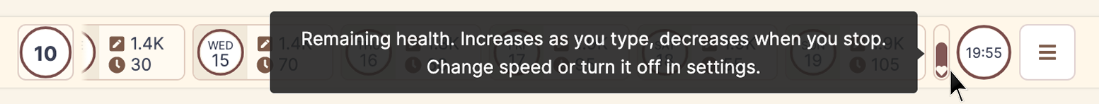 - If you manage to keep writing for the whole duration of the sprint without running out of health - you win, and the time gets added to your "focused time" stat for the day.