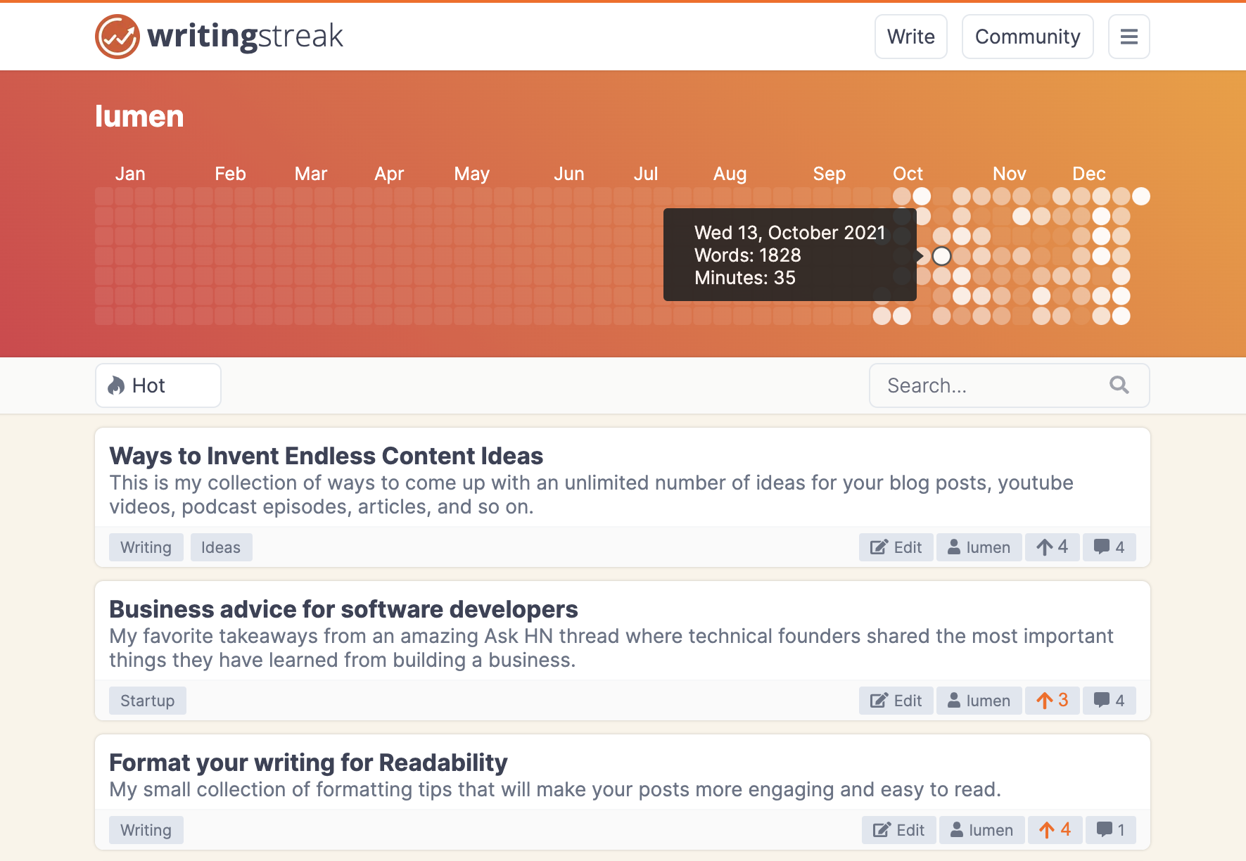On your profile page, you see a calendar that displays your writing stats for the whole year: