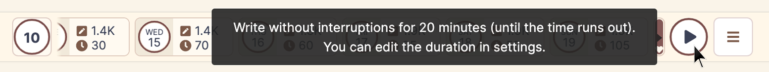 In the top-right corner, you see a timer. Set it for 20 minutes, write without interruptions, then take a 10 minute break and repeat.