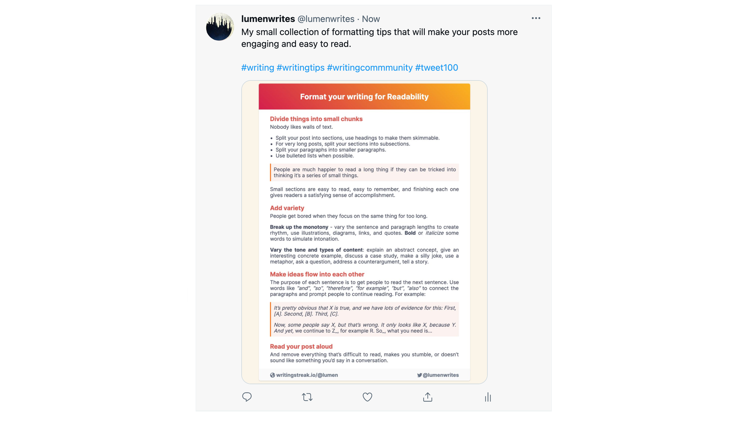 Share your work on social media as well. Our editor also has a feature that allows you to export your posts as images. Export your post, and publish it on Twitter:
