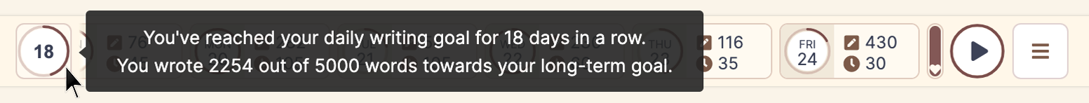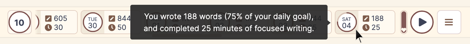 Each day shows you how many words you wrote, how close you are to accomplishing your daily goal, and how many minutes you have spent in an uninterrupted writing flow.